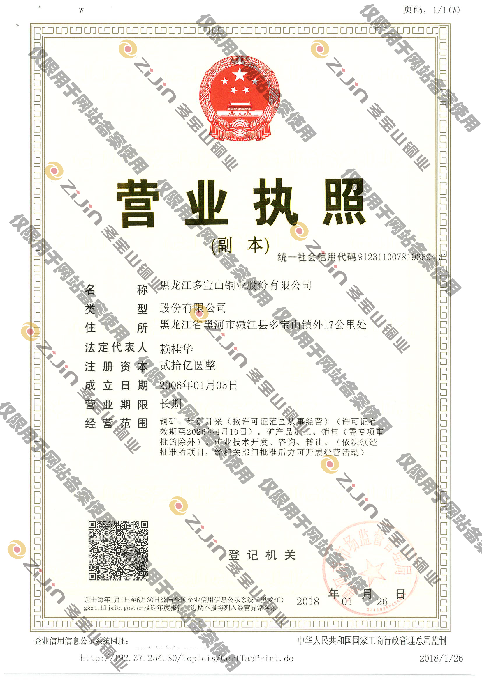 黑龍江多寶山銅業股份有限公司是紫金礦業集團股份有限公司的全資重點權屬企業。成立于2006年1月,注冊資本33.07億元,主導開發多寶山銅(鉬)礦、銅山礦,產品主要為銅金屬、鉬金屬及金、銀、錸等伴生貴金屬,日處理礦量規模達8萬噸。2023年產銅11.1萬噸,實現營業收入73.84億元,年末資產總額117億元。公司累計上繳稅收已突破80億元,不僅是黑河、嫩江兩級地方財政最主要的稅收來源之一,更是黑龍江省投資最多、生產能力最大的有色金屬礦山與低品位銅礦資源開發的典范,已然發展成為中...